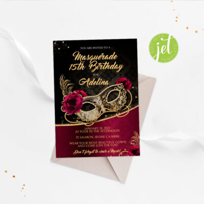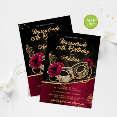 - Masquerade Birthday Invitation featuring an elegant gold mask, deep burgundy roses, and sparkling gold accents. This editable 15th birthday invite is perfect for a glamorous masquerade ball and fully customizable online. Add your own words! Make your favors one of a kind of ANY event! Try Demo, Copy and Paste…