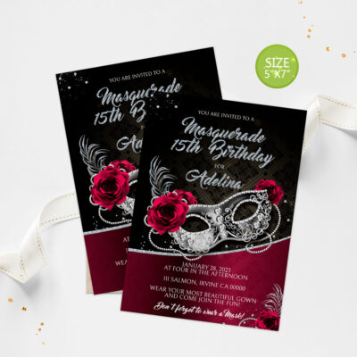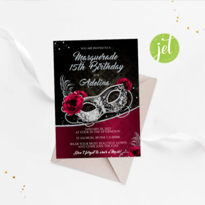 - Masquerade invitation featuring an elegant silver mask, deep burgundy roses, and sparkling silver accents. This editable 15th birthday invite is perfect for a glamorous masquerade ball and fully customizable online. Try Demo, Copy and Paste into browser. https://jettemplate.com/demo/SH3675 This is a Digital Item that you'll be able to access and…
