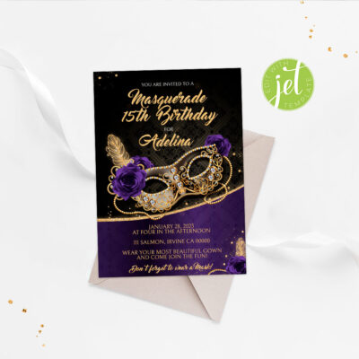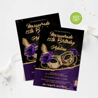 - Purple Gold Masquerade Birthday Invitation featuring an elegant gold mask, deep purple roses, and sparkling gold accents. This editable 15th birthday invite is perfect for a glamorous masquerade ball and fully customizable online. Try Demo, Copy and Paste into browser. https://jettemplate.com/demo/HP4706 This is a Digital Item that you'll be able…