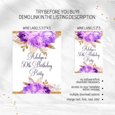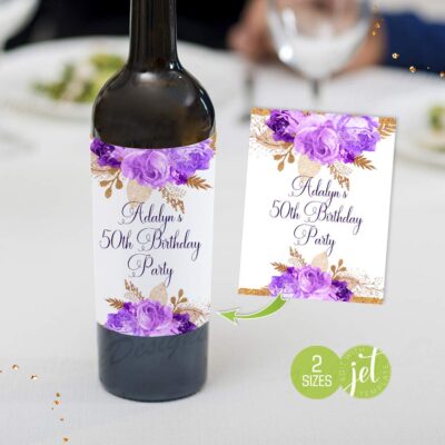 - Purple Gold Wine Label adds a sophisticated floral touch to your wine bottles — perfect for weddings, birthdays, or bridal showers. Try Demo, Copy and Paste into browser. https://jettemplate.com/demo/FLG5102 This is a Digital Item that you'll be able to access and EDIT yourself through a link sent to your email.