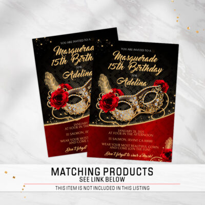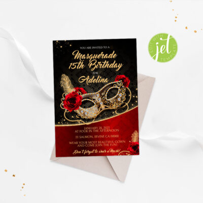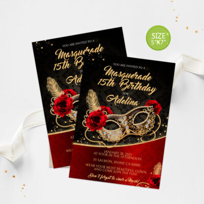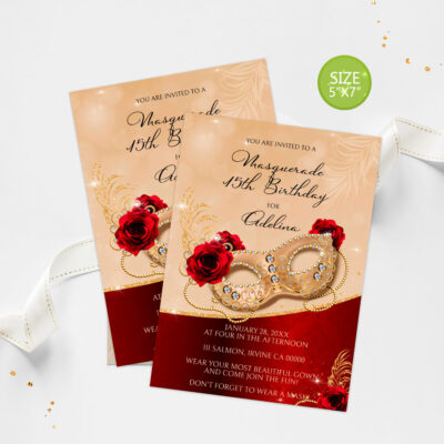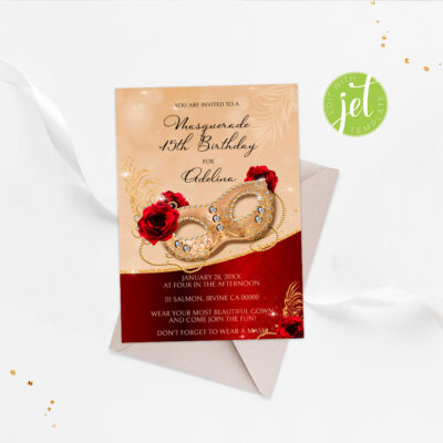- Masquerade invitation featuring an elegant gold mask, red roses, and sparkling gold accents. This editable 15th birthday invite is perfect for a glamorous masquerade ball and fully customizable online. Try Demo, Copy and Paste into browser. https://jettemplate.com/demo/DA4568 This is a Digital Item that you'll be able to access and EDIT…