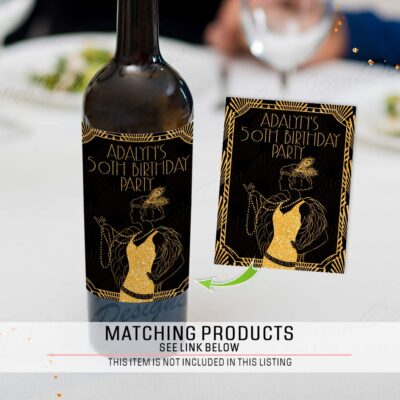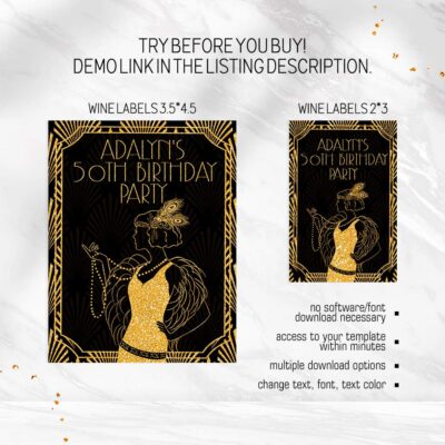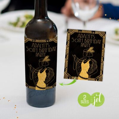- Roaring Twenty wine Labels adds a sophisticated touch to your wine bottles — perfect for weddings, birthdays, or bridal showers. Try Demo, Copy and Paste into browser. https://jettemplate.com/demo/RLO6600 This is a Digital Item that you'll be able to access and EDIT yourself through a link sent to your email.