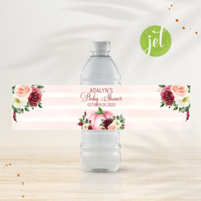 - Pastel Pink Pumpkin Baby Shower Water Bottle Labels are the perfect personalized touch for your Fall Baby Shower. Add your own words! Make your favors one of a kind! Try Demo, Copy and Paste into browser. https://jettemplate.com/demo/PS4137 This is a Digital Item that you'll be able to access and EDIT…