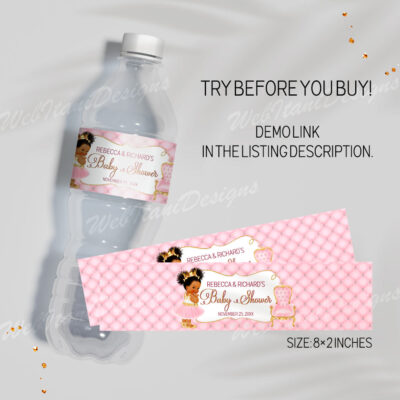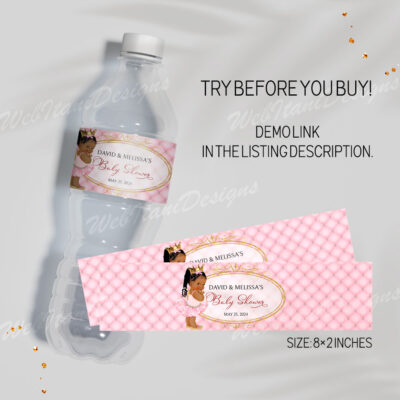 - Pink Princess Baby Shower Water Bottle Labels are size 8"x2". Little Princess on the way Bottle Labels are perfect for Girl Baby Shower party! Add your own words! Make your favors one of a kind! Try Demo, Copy and Paste into browser. https://jettemplate.com/demo/DN8770 This is a Digital Item that you'll…