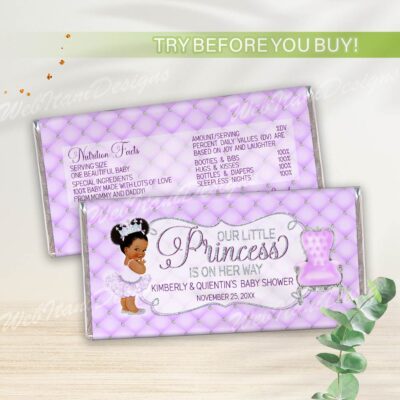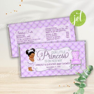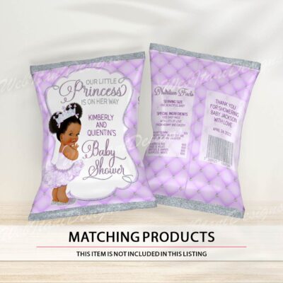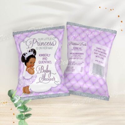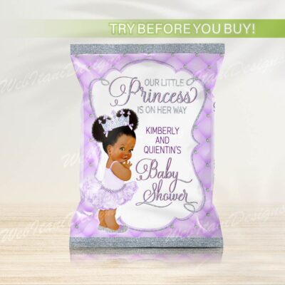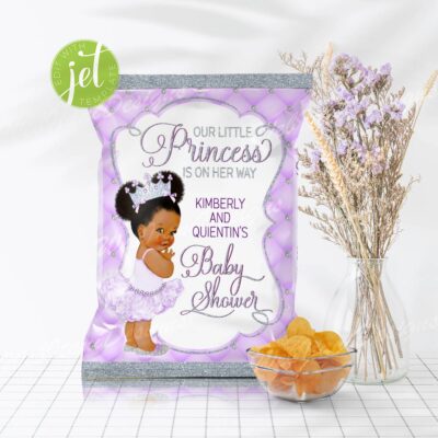 Little Purple Princess Chips bags with a Afro Princess ballerina in a tutu and a silver crown for Girl Baby shower