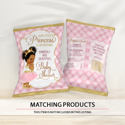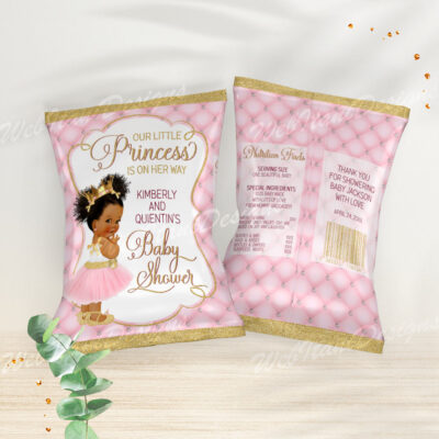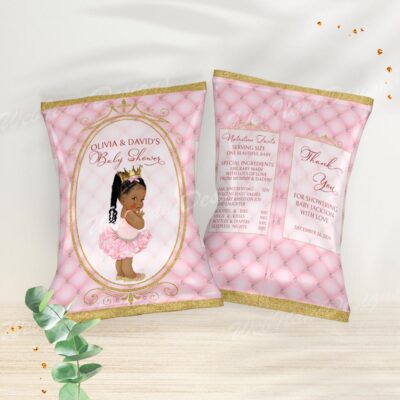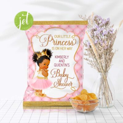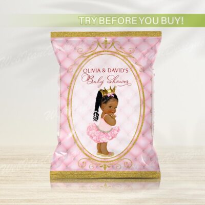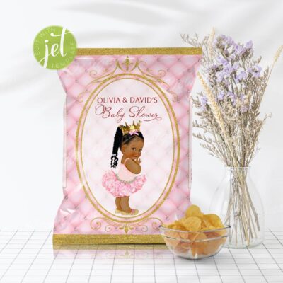 - Pink princess baby shower chip bag template perfect for a royal celebration! This editable party favor features a beautiful baby girl in a tutu and gold crown, ideal for a glamorous and personalized baby shower. Try Demo, Copy and Paste into browser. https://jettemplate.com/demo/QZ6967 This is a Digital Item that you'll…