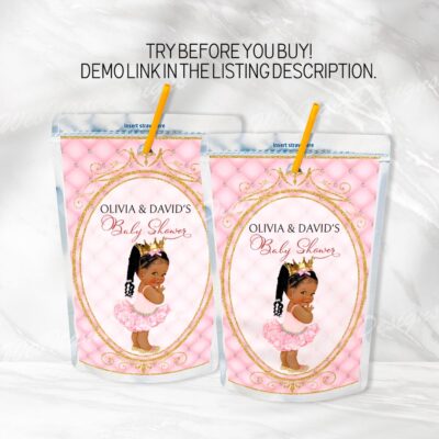 - Pink Princess Baby Shower Juice labels for Girl Baby shower, ideal for a your party. Try Demo, Copy and Paste into browser. https://jettemplate.com/demo/MP3996 This is a Digital Item that you'll be able to access and EDIT yourself through a link sent to your email.