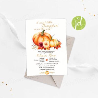 - Pumpkin baby shower invitation perfect for an autumn celebration! This editable fall baby shower invite features watercolor pumpkins, warm florals, and rustic leaves. Try Demo, Copy and Paste into browser. https://jettemplate.com/demo/QH6796 This is a Digital Item that you'll be able to access and EDIT yourself through a link sent to…