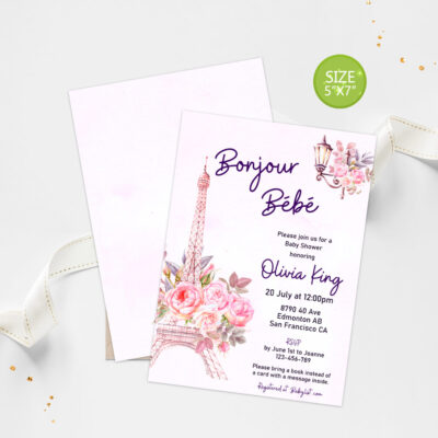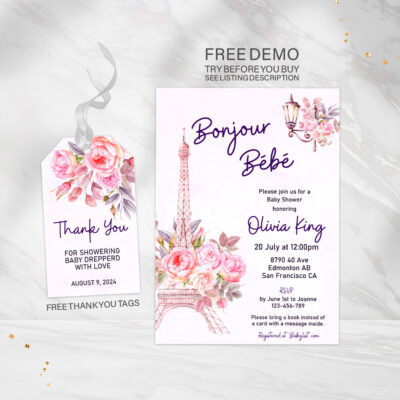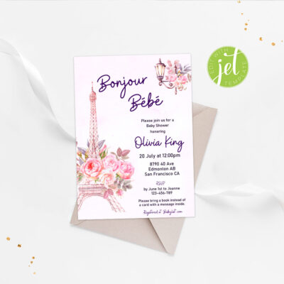 - Bonjour Baby Shower Invitation — an elegant Paris-themed invite perfect for celebrating a baby girl. Try Demo, Copy and Paste into browser. https://jettemplate.com/demo/MHF9855 This is a Digital Item that you'll be able to access and EDIT yourself through a link sent to your email.