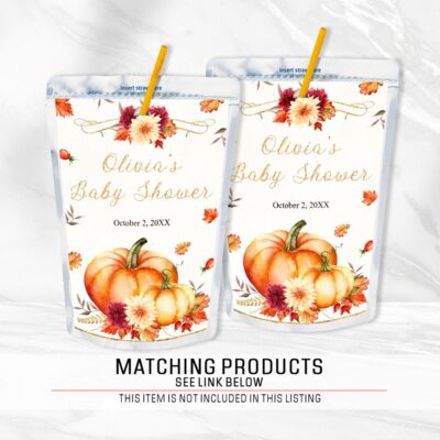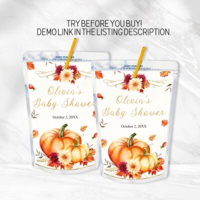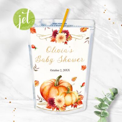 - Pumpkin juice pouch label designed for a cozy autumn baby shower! Try Demo, Copy and Paste into browser. https://jettemplate.com/demo/KX9730 This is a Digital Item that you'll be able to access and EDIT yourself through a link sent to your email.