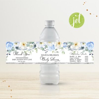 - Blue Floral Water Bottle Label is the perfect personalized touch for your baby boy shower. Add your own words! Make your favors one of a kind! Try Demo, Copy and Paste into browser. https://jettemplate.com/demo/PV5539 This is a Digital Item that you'll be able to access and EDIT yourself through a…
