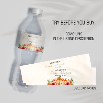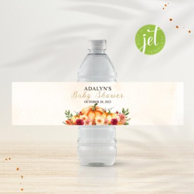 - Pastel Pumpkin Baby Shower Water Bottle Labels are the perfect personalized touch for your Fall Baby Shower. Add your own words! Make your favors one of a kind! Try Demo, Copy and Paste into browser. https://jettemplate.com/demo/NL3385 This is a Digital Item that you'll be able to access and EDIT yourself…