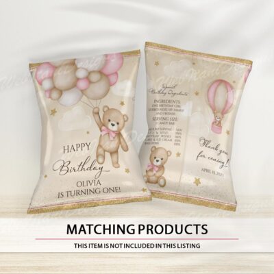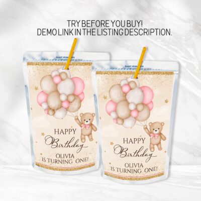 - Girl Teddy Bear juice label designed for a sweet first birthday party. This editable digital wrapper features a soft pastel teddy bear with balloons — perfect for printing custom snack favors at home. Try Demo, Copy and Paste into browser. https://jettemplate.com/demo/LH8373 This is a Digital Item that you'll be able…
