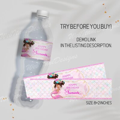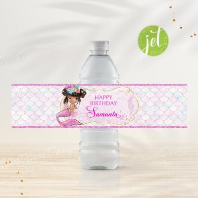 - Pink Mermaid water bottle labels are perfect for Girl's Birthday Party. Mermaid Water Bottle Labels are size 8"x2". Add your own words! Make your favors one of a kind! Try Demo, Copy and Paste into browser. https://jettemplate.com/demo/TS4374 This is a Digital Item that you'll be able to access and EDIT…