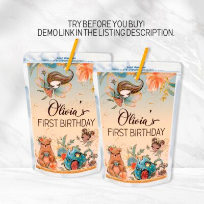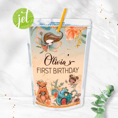 - Editable Whimsical Fairy Juice Pouch Label is perfect for your little girl’s birthday party. Try Demo, Copy and Paste into browser. https://jettemplate.com/demo/US9547 This is a Digital Item that you'll be able to access and EDIT yourself through a link sent to your email.