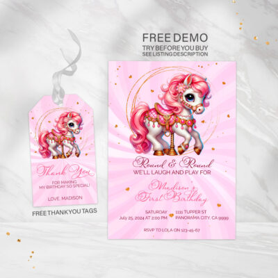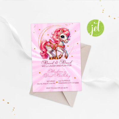 - Pink Carousel Birthday Invitation is the perfect way to invite guests to a magical 1st birthday celebration. Try Demo, Copy and Paste into browser. https://jettemplate.com/demo/JJE7009 This is a Digital Item that you'll be able to access and EDIT yourself through a link sent to your email.
