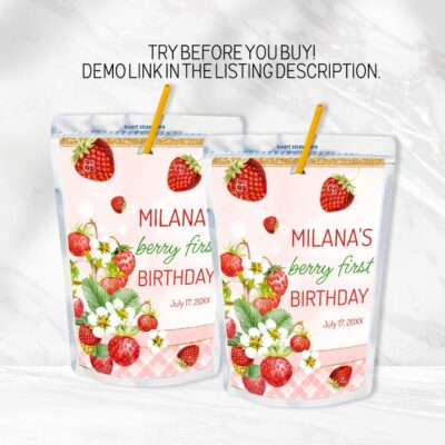 - Berry first birthday juice label is a sweet and fresh printable for your little girl’s first birthday party. Try Demo, Copy and Paste into browser. https://jettemplate.com/demo/LH5027 This is a Digital Item that you'll be able to access and EDIT yourself through a link sent to your email.
