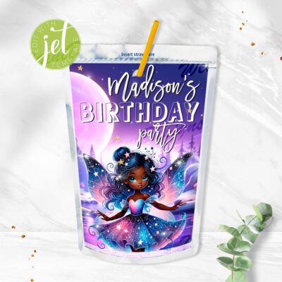 - Fairy Juice Labels are the perfect touch for your little girl’s first birthday celebration. This editable purple and gold fairy juice pouch label features a magical Black fairy in a sparkly dress, adding whimsical charm to your fairy birthday party. Try Demo, Copy and Paste into browser. https://jettemplate.com/demo/ZO7717 This is…