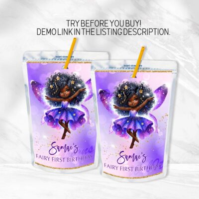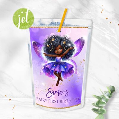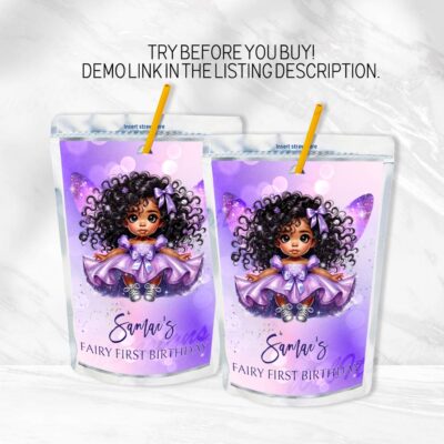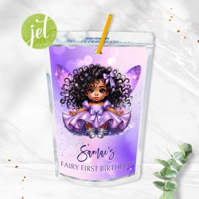 - Purple Fairy Juice Labels are the perfect touch for your little girl’s first birthday celebration. This editable purple and gold fairy juice pouch label features a magical Black fairy in a sparkly dress, adding whimsical charm to your fairy birthday party. Try Demo, Copy and Paste into browser. https://jettemplate.com/demo/RK7705 This…