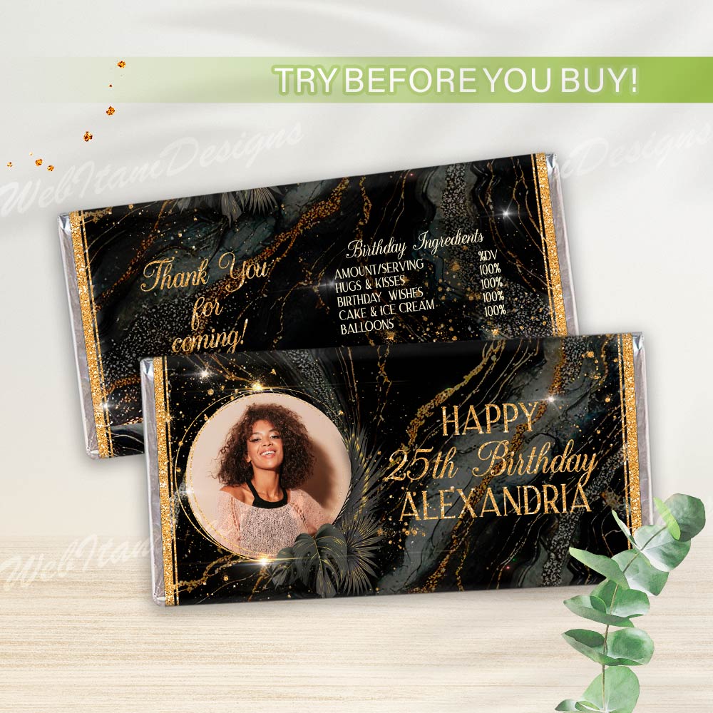 Do you want to style a Black Gold birthday party with party favors to remember? Use this editable candy bar wrappers template with gold glitter and surprise the party guests.