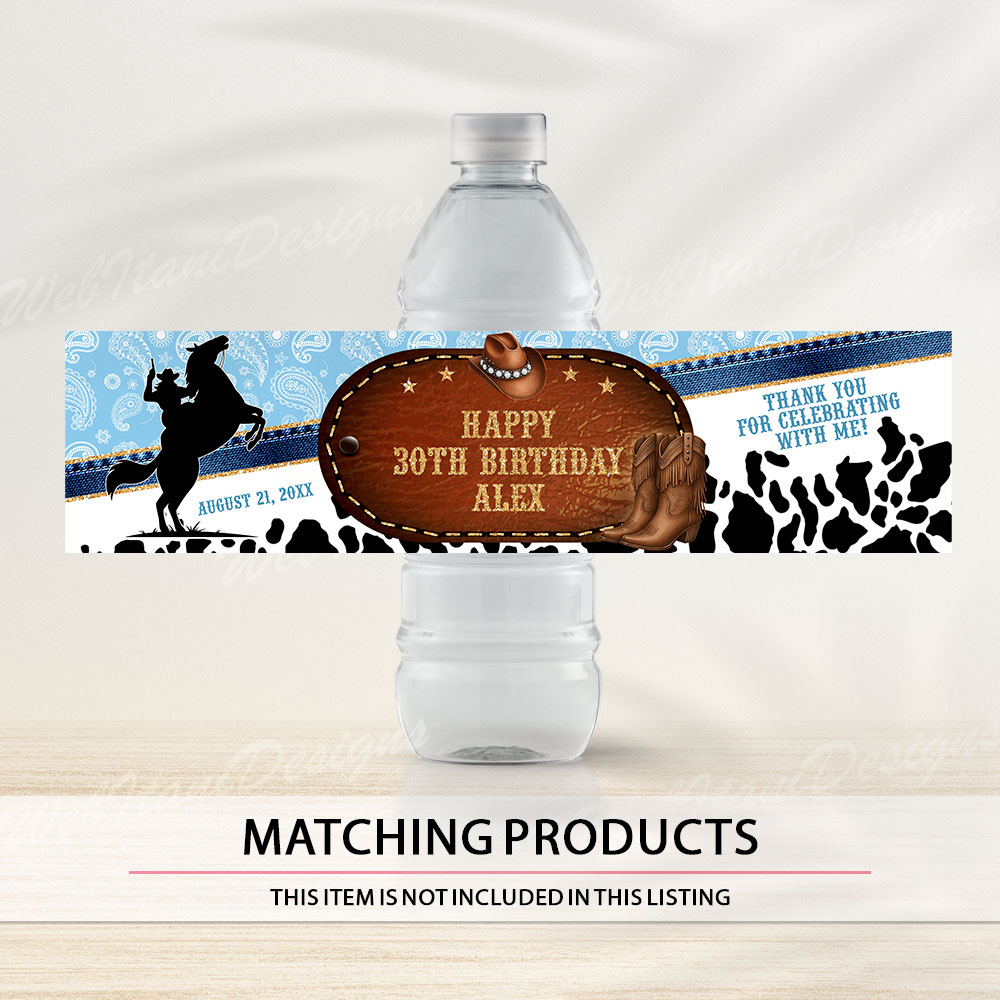 Blue western party candy bar wrapper template designed for cowboy-themed celebrations. This editable digital file features cow print, boots, and bandana accents — perfect for customizing birthday favors and adding a rustic rodeo vibe to your party. Instantly download, personalize, and print at home.