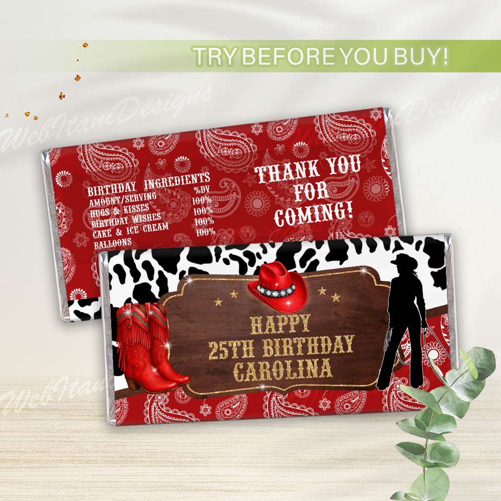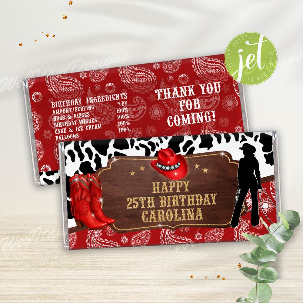 Do you want to style a Red Rodeo Party with party favors to remember? Use this editable Cowgirl candy bar wrappers template and surprise the party guests.