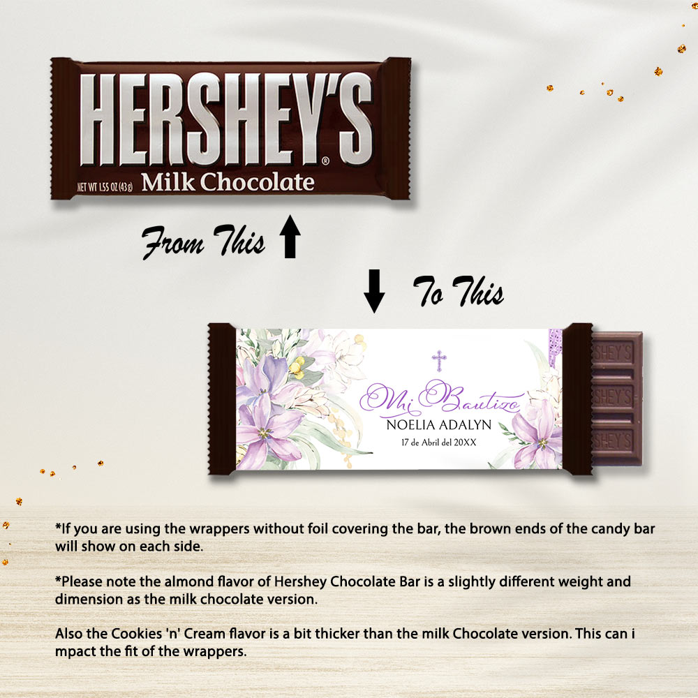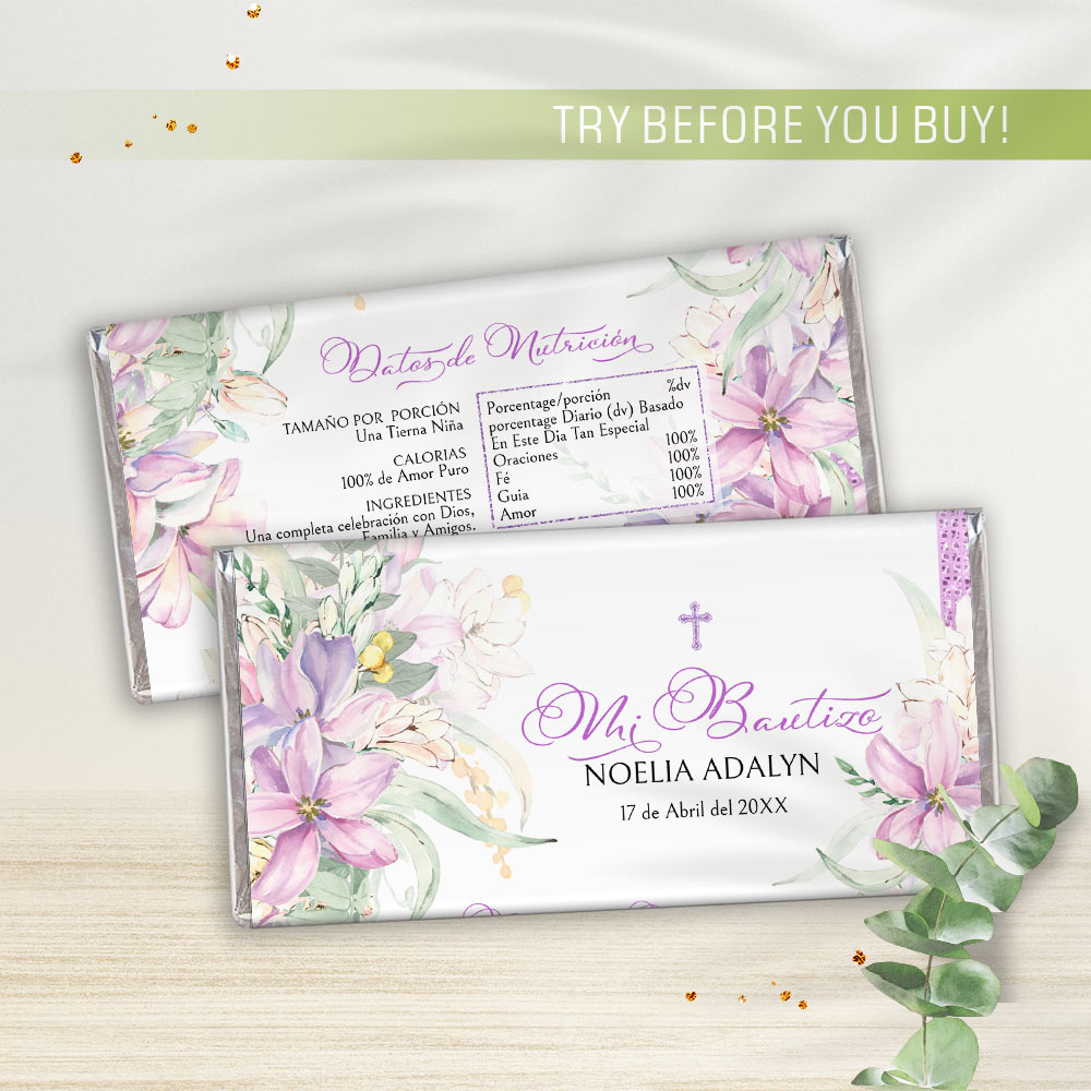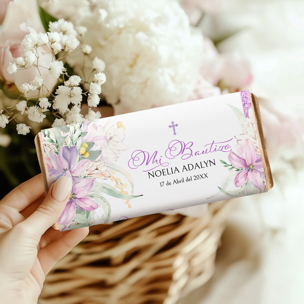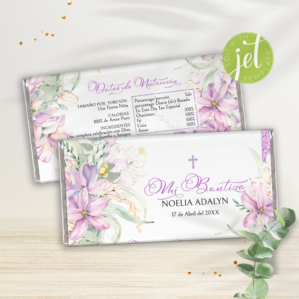 Editable Candy Bar Wrappers with purple flowers bring elegance to your Purple Bautizo. These editable wrappers are a perfect part of a spanish baptism theme, creating unforgettable Bautizo party supplies that guests will love.