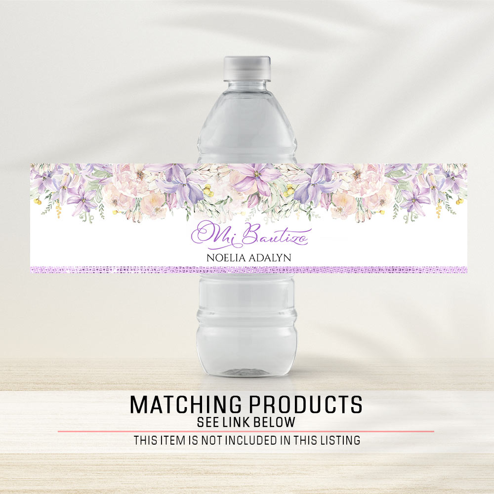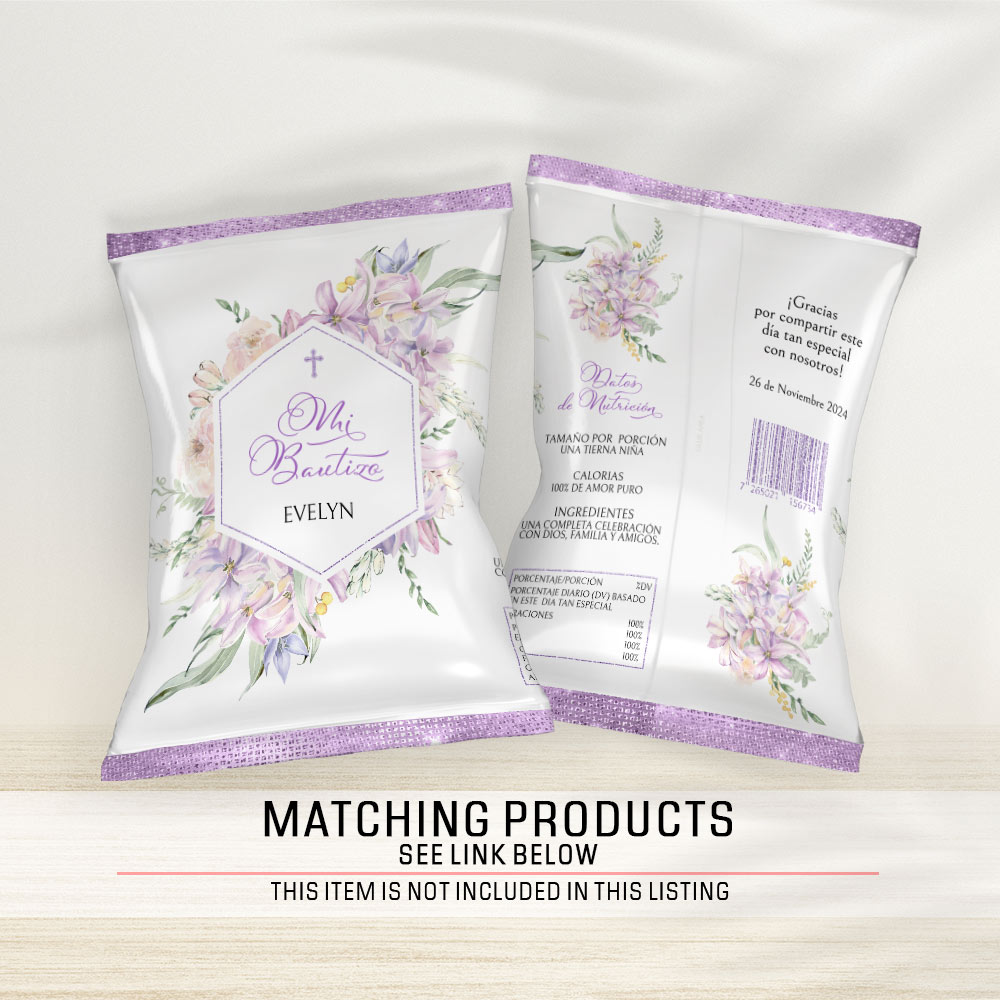 Bring it all together with matching Purple Bautizo chip bags, Purple Bautizo water bottle labels, Purple Bautizo Juice Bag Pouch Label and beverage pouch labels for a cohesive party setup.