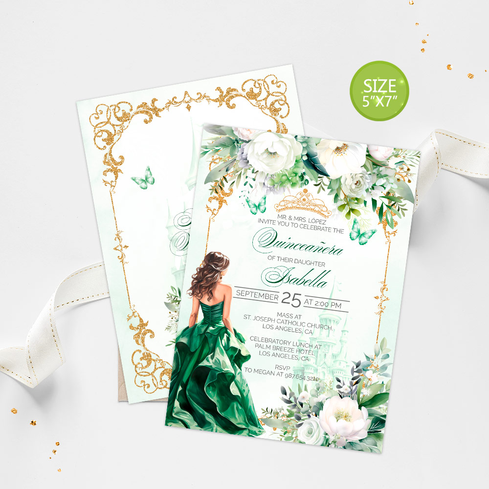 Copy and paste the URL below to the template demo Editable Emerald green Quinceañera Invitation:
