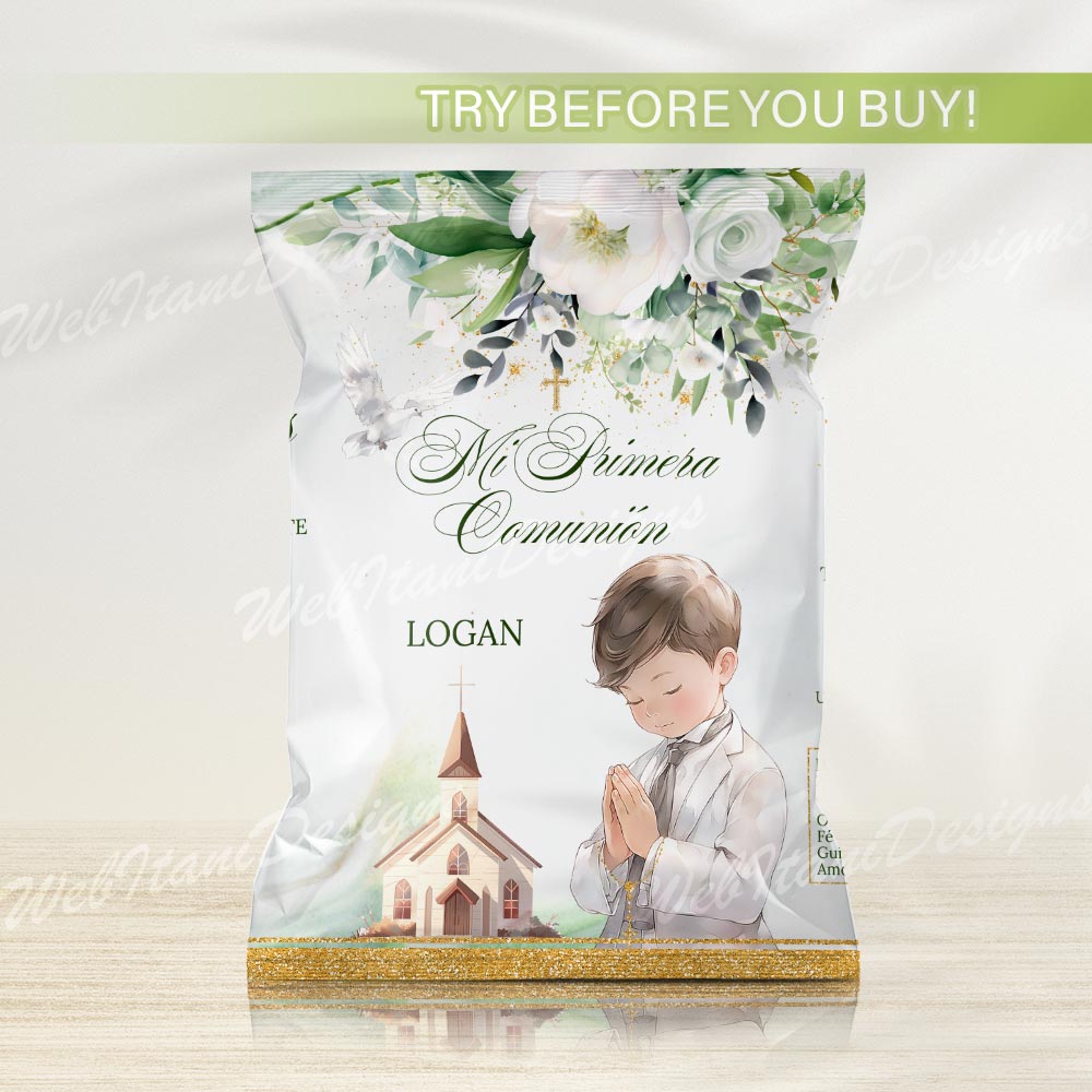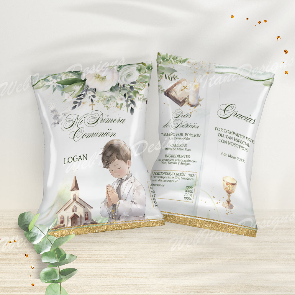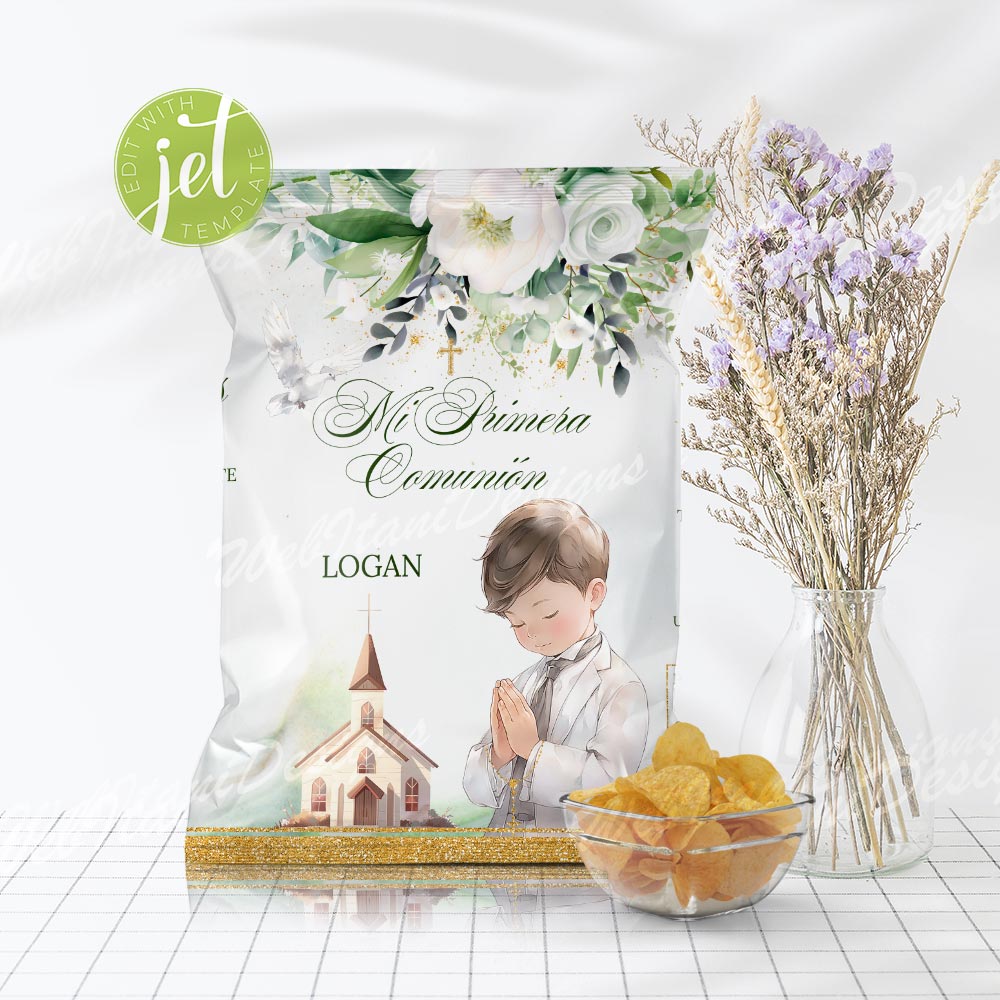 Celebrate a special moment with these elegant editable religious chip bags adorned with white and green flowers, ideal for a Boy’s communion. Personalize your favors and make them truly unique for any event.