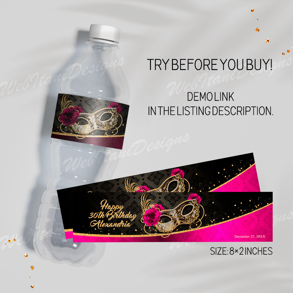 ★Copy and paste the URL below to the template demo Fuchsia Pink Masquerade water bottle labels: