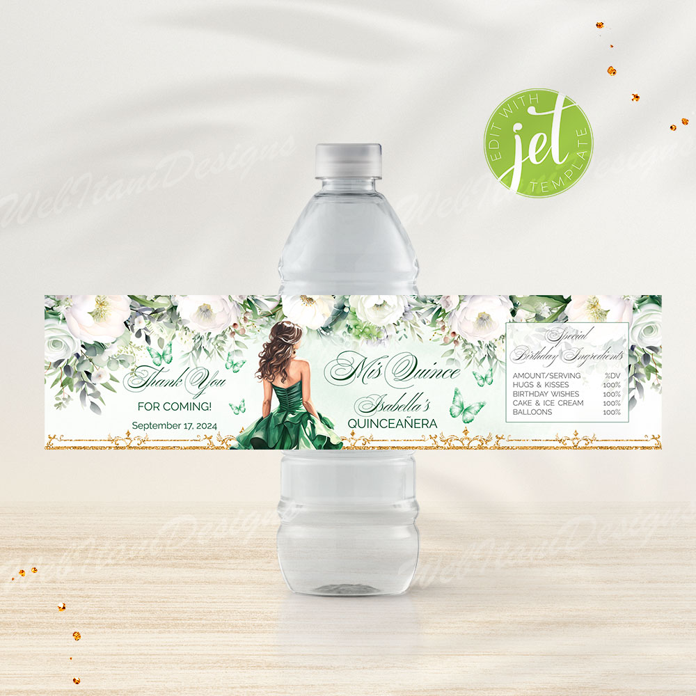 Green Gold Quinceanera Water Bottle Labels are size 8″x2″.