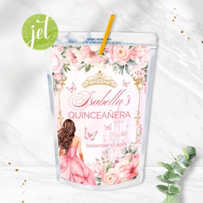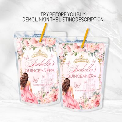 Green Quinceanera Bottle Labels with flowers and a gold crown are perfect for Sweet 16 Party or Mis Quince Anos Birthday!