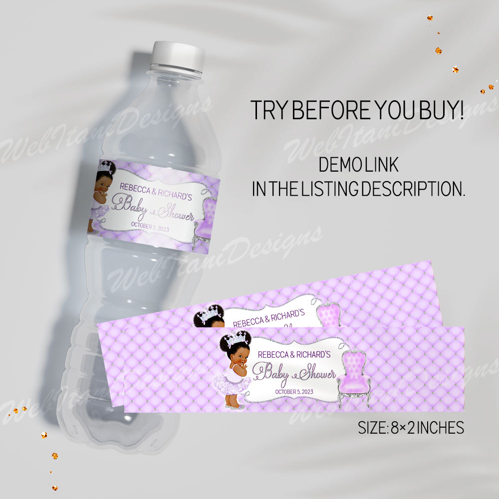 Little Purple Princess Water Bottle Labels are size 8″x2″. Little Princess on the way Bottle Labels are perfect for Girl Baby Shower party!