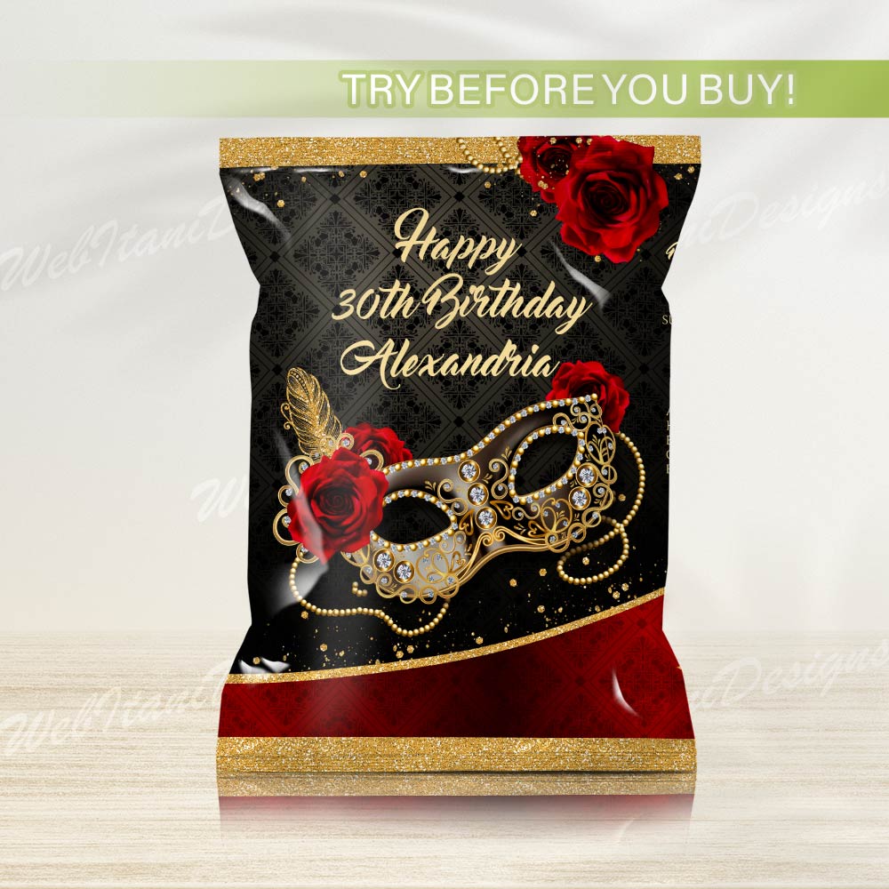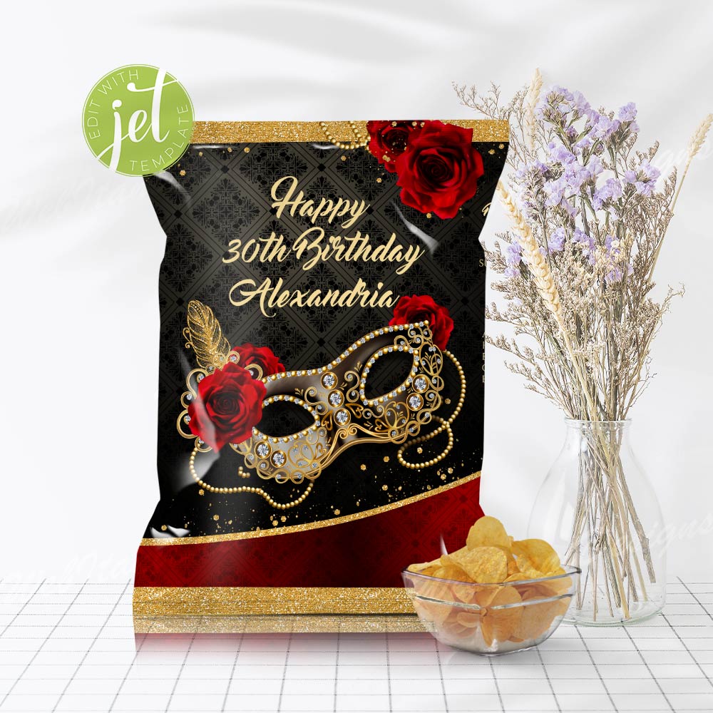 Masquerade Chip Bag is a glamorous addition to your red and gold masquerade party theme. Instantly download and personalize this editable party favor for birthdays, quinceañeras, or elegant masquerade balls. Use it with matching water labels, juice box wraps, and candy bar wrappers for a coordinated celebration look.