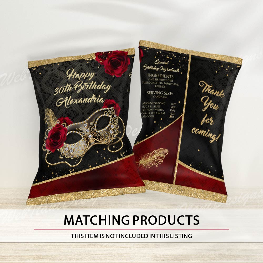 Pair this with the Red Gold Water Bottle Label for Masquerade party and the Red Gold Masquerade Candy Bar Wrappers for a coordinated party theme.