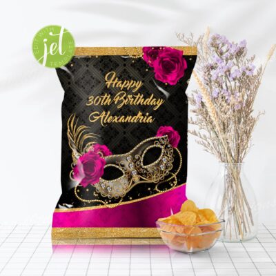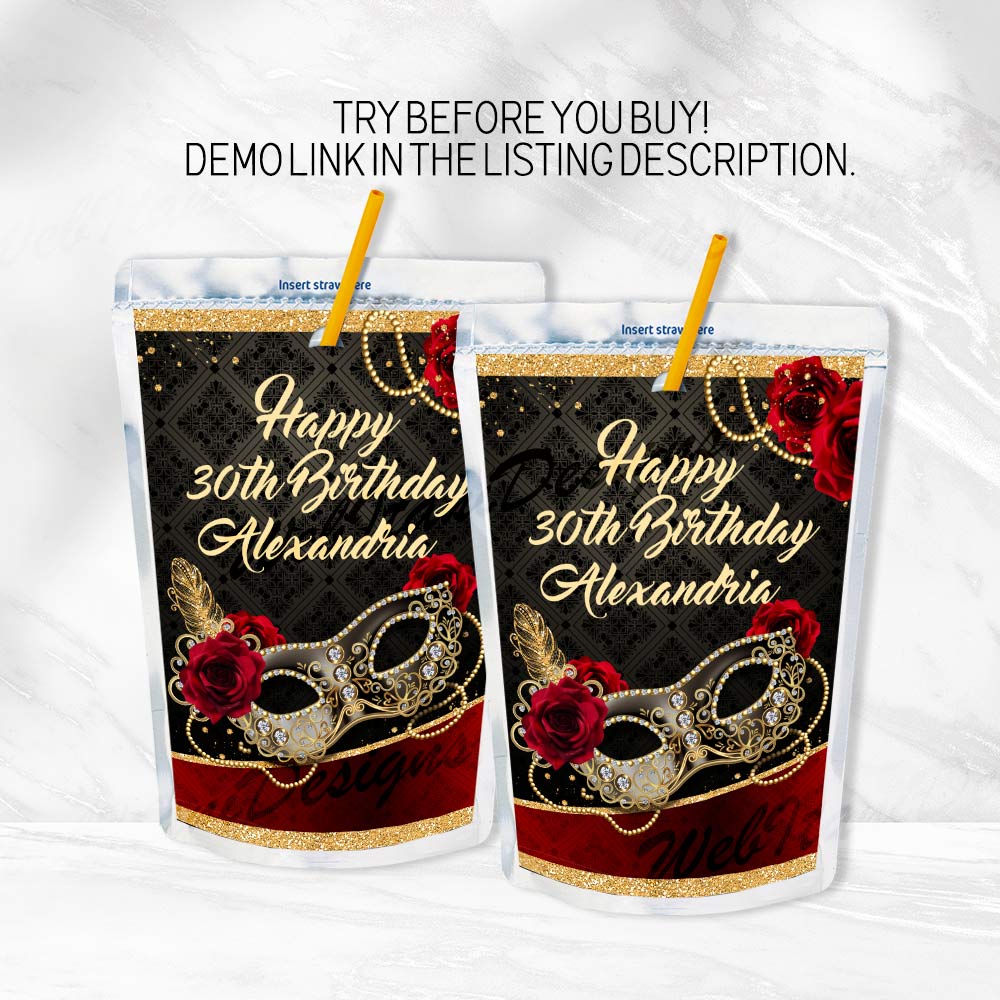 Masquerade Juice Labels add dramatic flair to your birthday or themed event. With a luxurious black, red, and gold color scheme, roses, pearls, and a jeweled mask, these editable labels are perfect for DIY printing and instant party glamour.