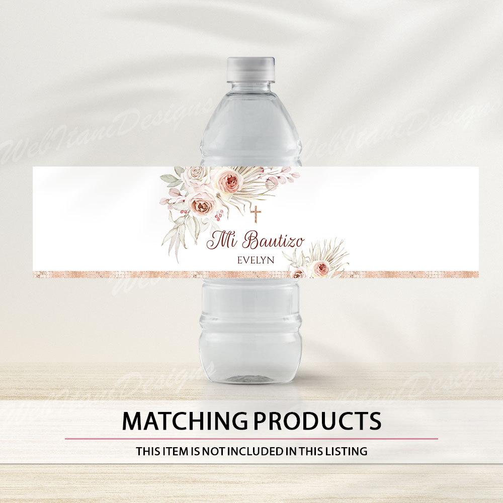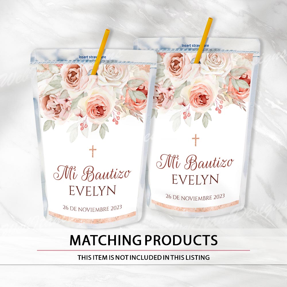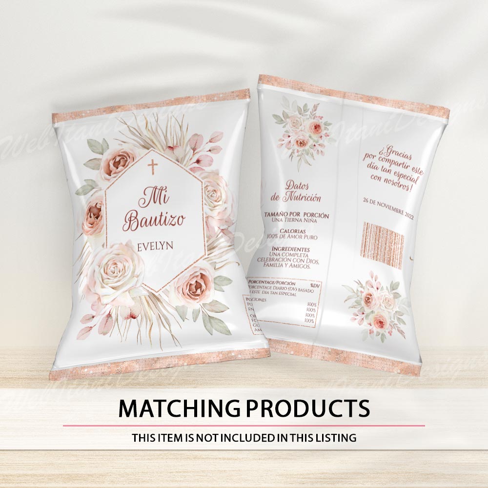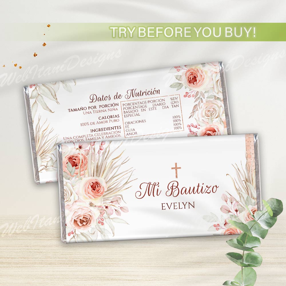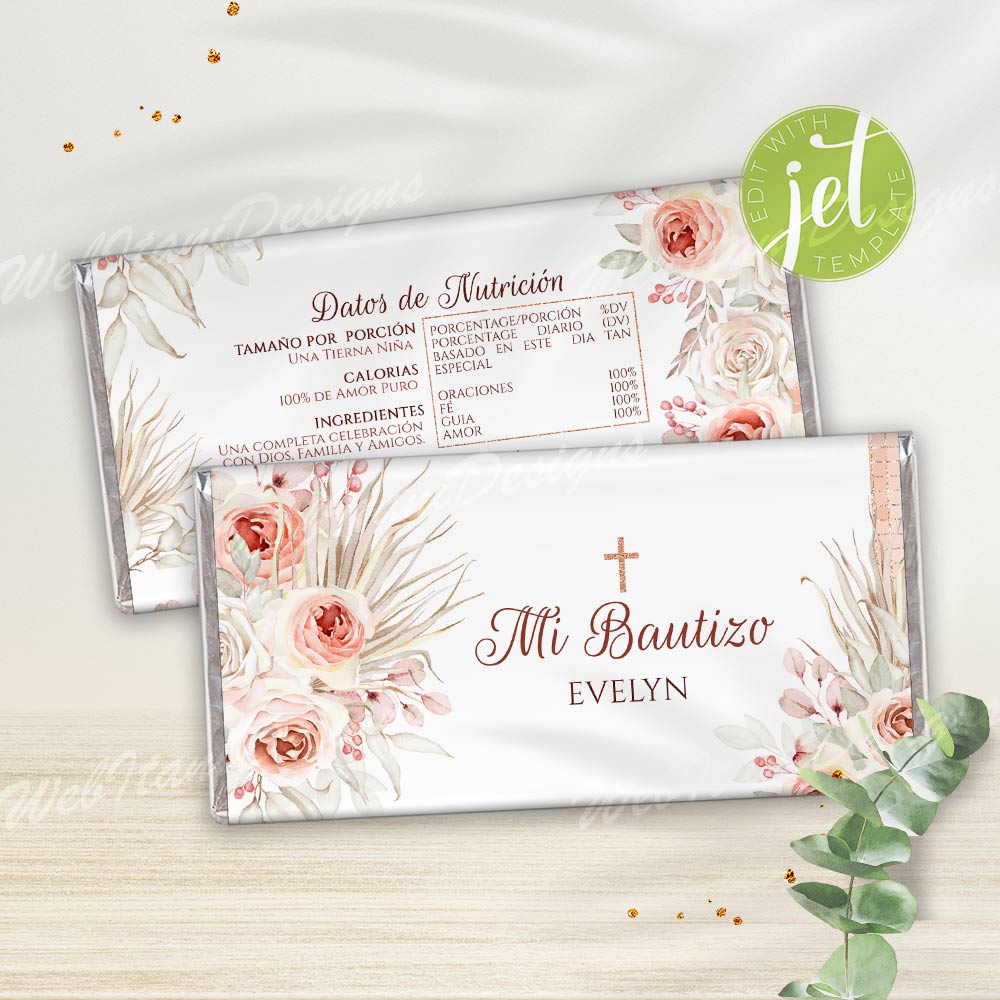 Mi bautizo candy bar wrappers turn any standard-size chocolate bar into a delicate party treat. Designed with watercolor roses and soft tones, they’re ideal for creating memorable favors for a baby girl’s baptism.