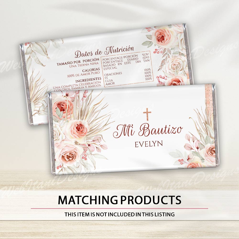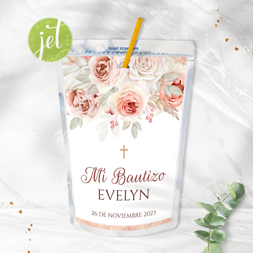 Mi bautizo juice labels are perfect for dressing up juice boxes at a baptism celebration. With a matching floral design, they bring elegance to even the smallest party details.