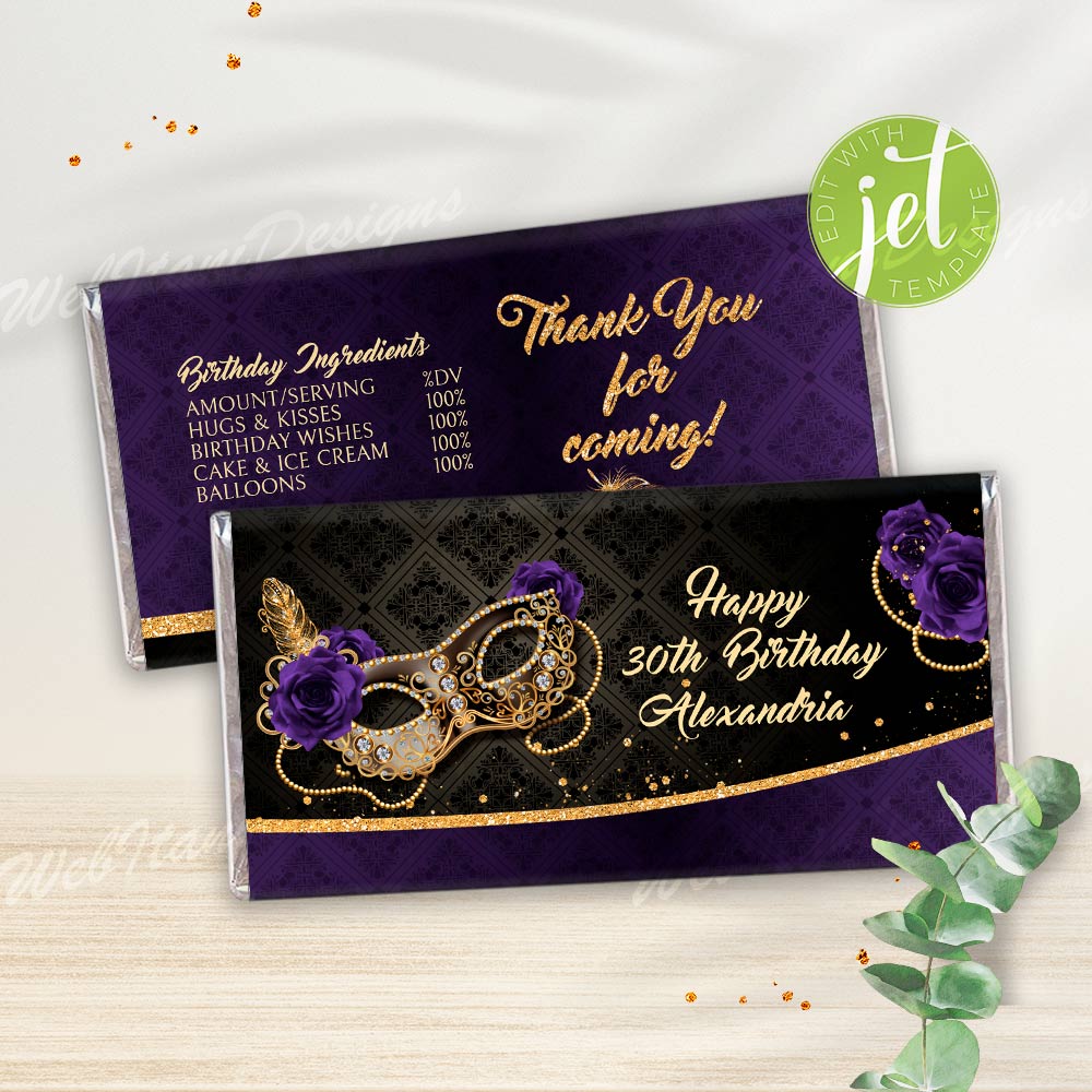 Do you want to style a Purple Gold Masquerade Ball with party favors to remember? Use this editable candy bar wrappers template with gold glitter and surprise the party guests.