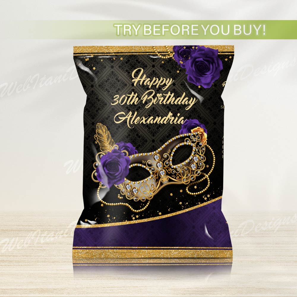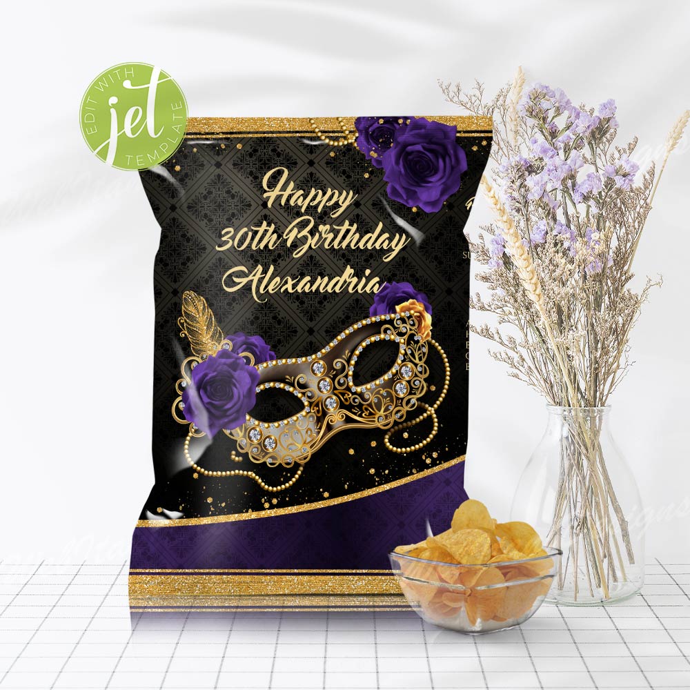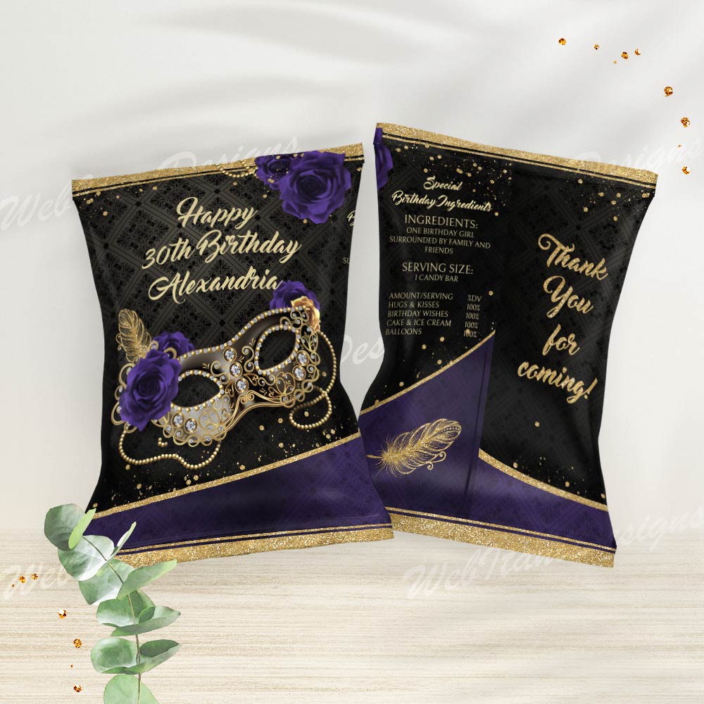 Purple Gold Black Masquerade Ball chip bags with Masquerade Mask are perfect for any occasion or event! Add your own words! Make your favors one of a kind of ANY event!