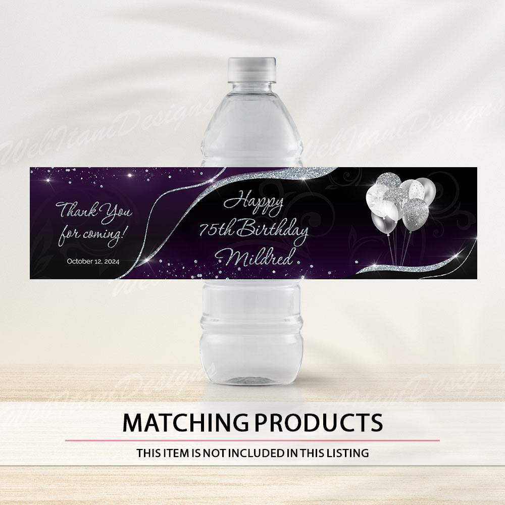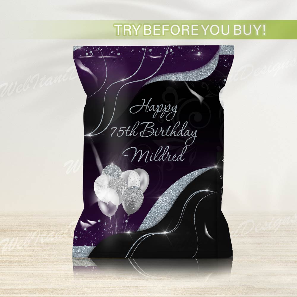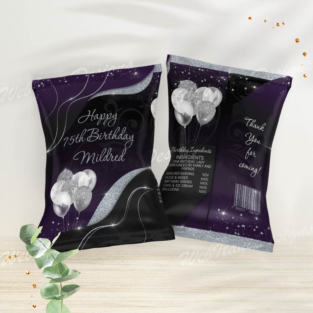 Purple Silver Chip Bag Wrapper adds sparkle and style to your snack table! Designed with vibrant balloons and silver glitter effects, this editable wrapper is perfect for girl birthday or quince parties.