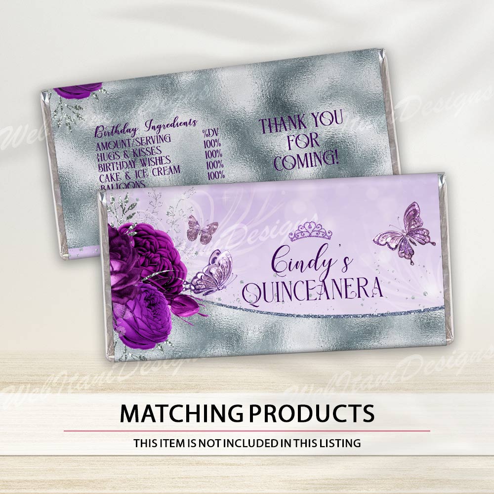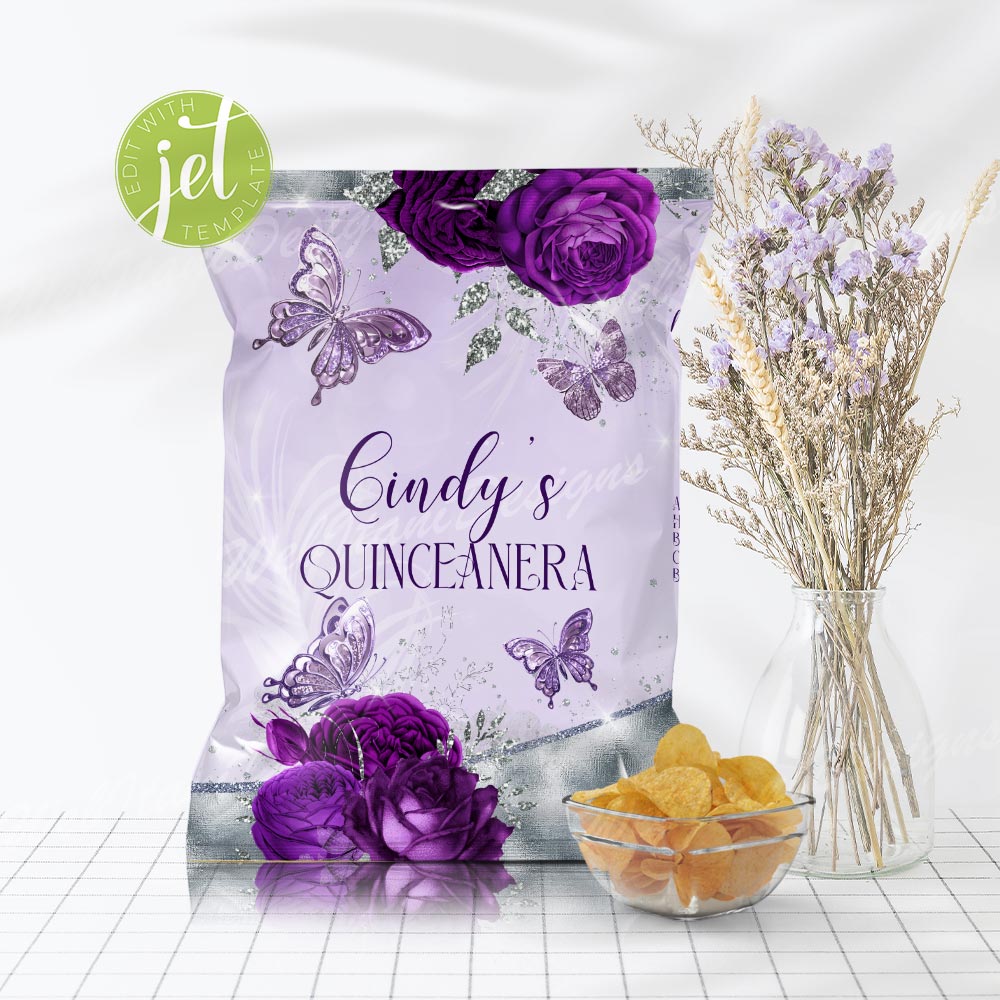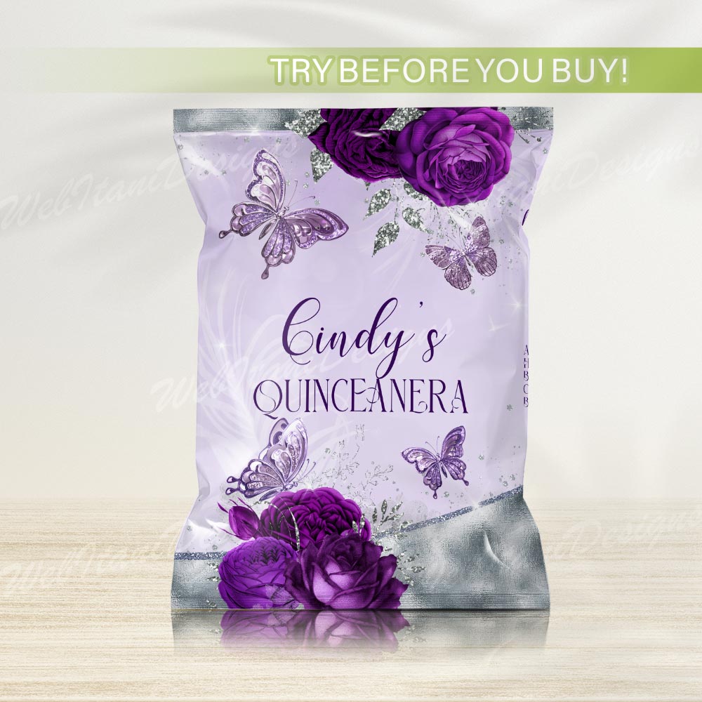 Quinceañera chip bags in royal purple and shimmering silver are perfect for a 15th birthday celebration. Personalize with your name and details to create unforgettable party treats.