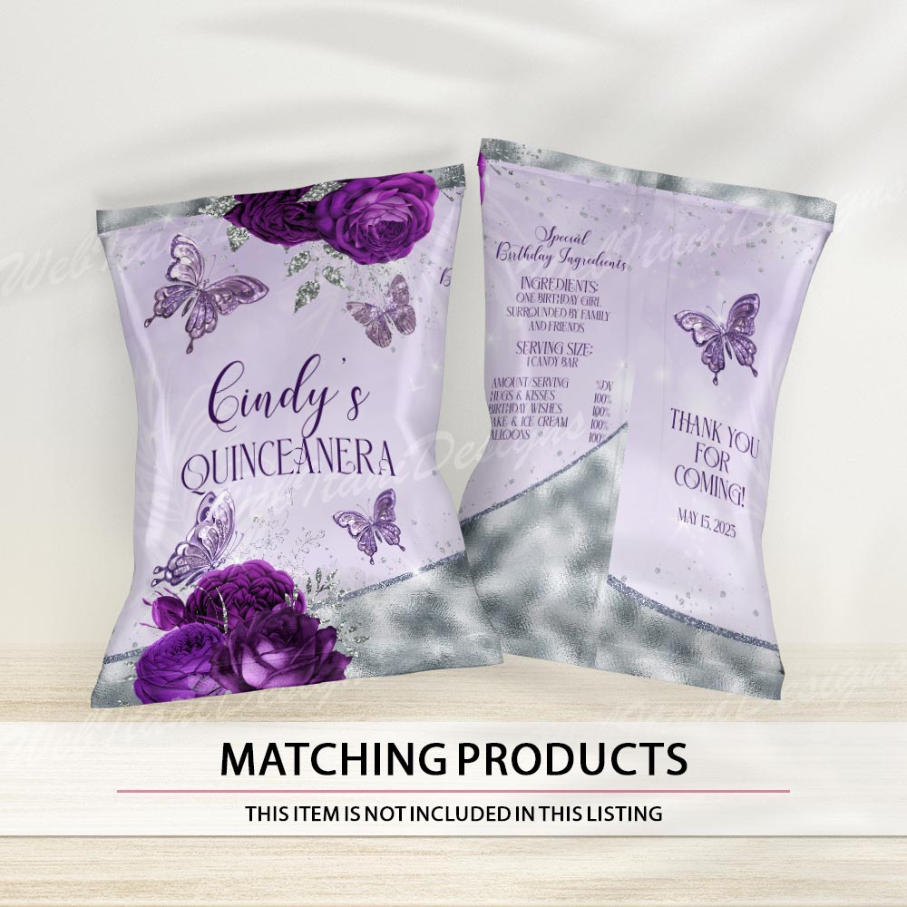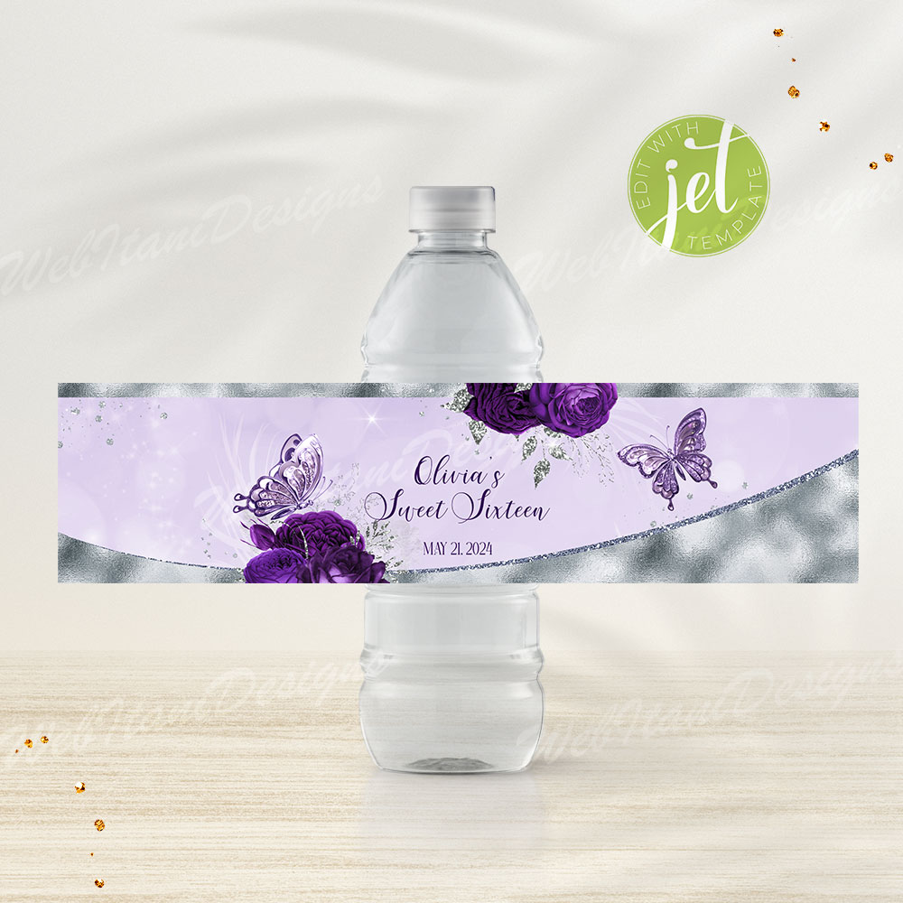 Quinceañera water bottle labels add a polished and coordinated look to your 15th birthday party. With purple florals and silver sparkle, they bring a touch of elegance to every detail.