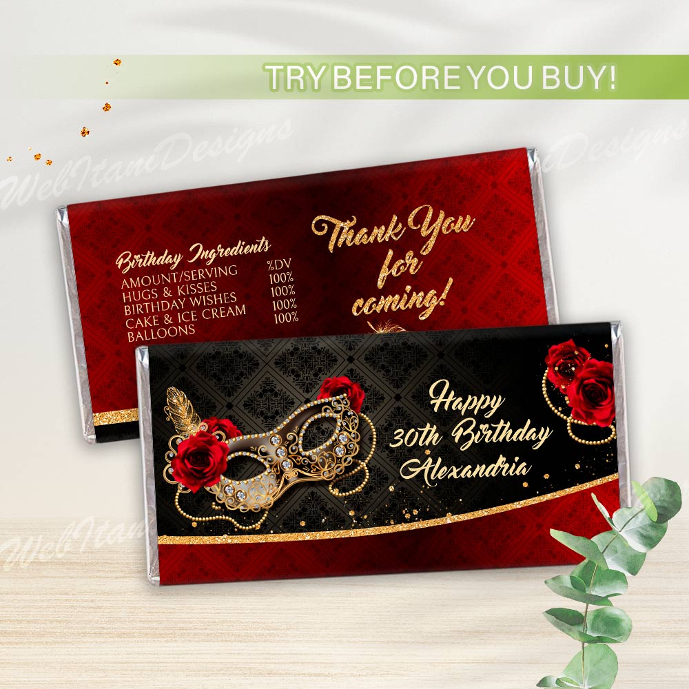 Red Gold Masquerade Candy Bar Wrapper is the perfect touch to elevate your party favors. Customize this editable template with gold glitter details to impress your guests and complete your masquerade theme.