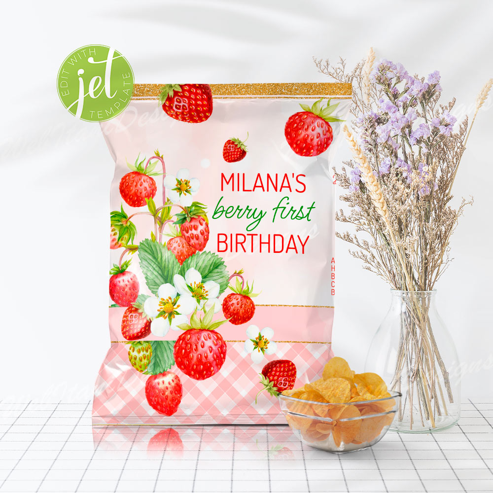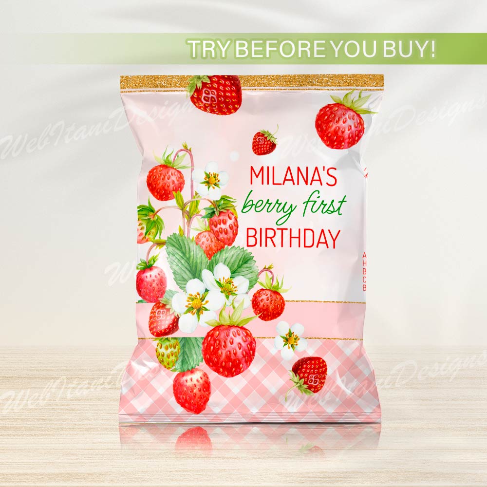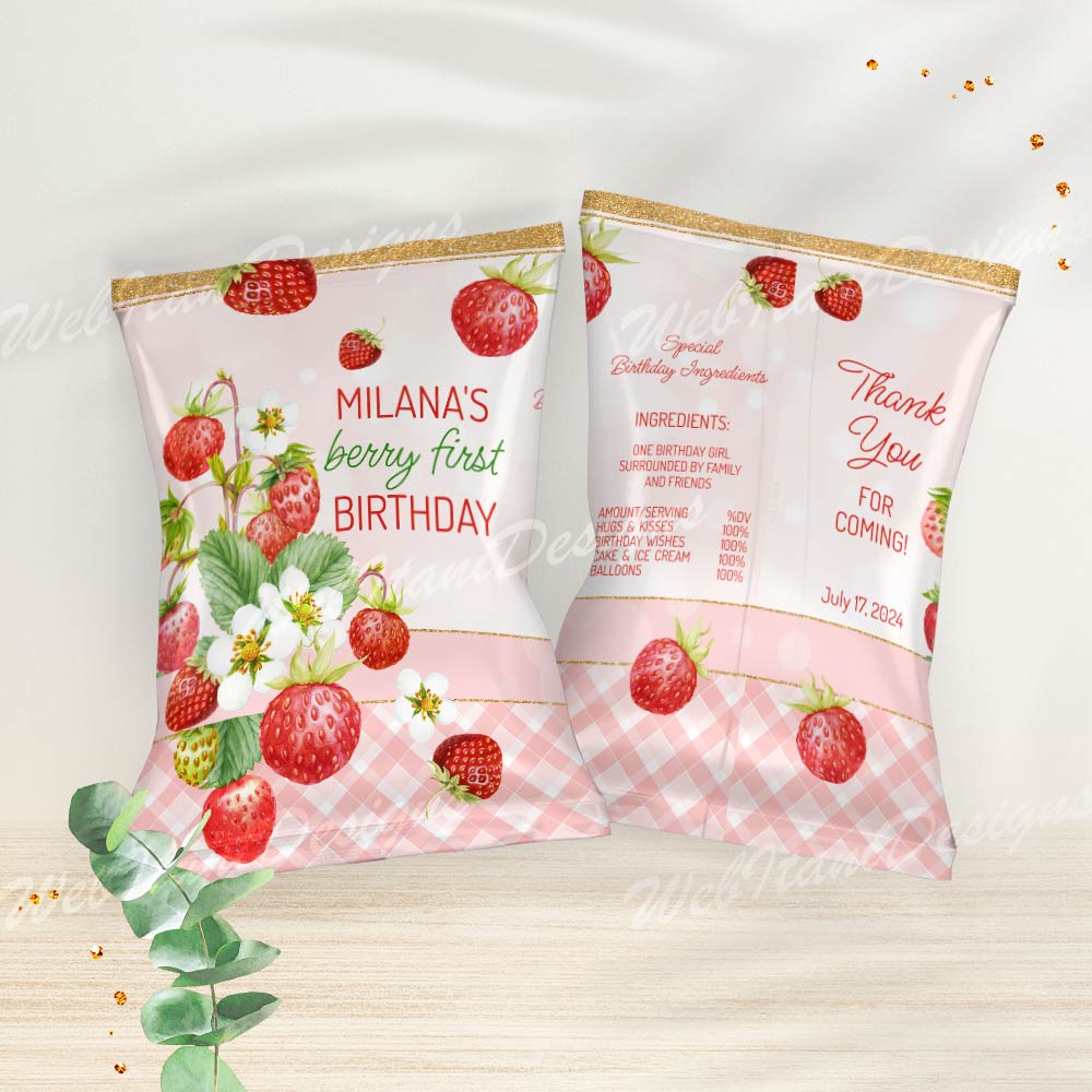 Strawberry First Birthday Chip Bag Template are perfect for Girl First birthday!