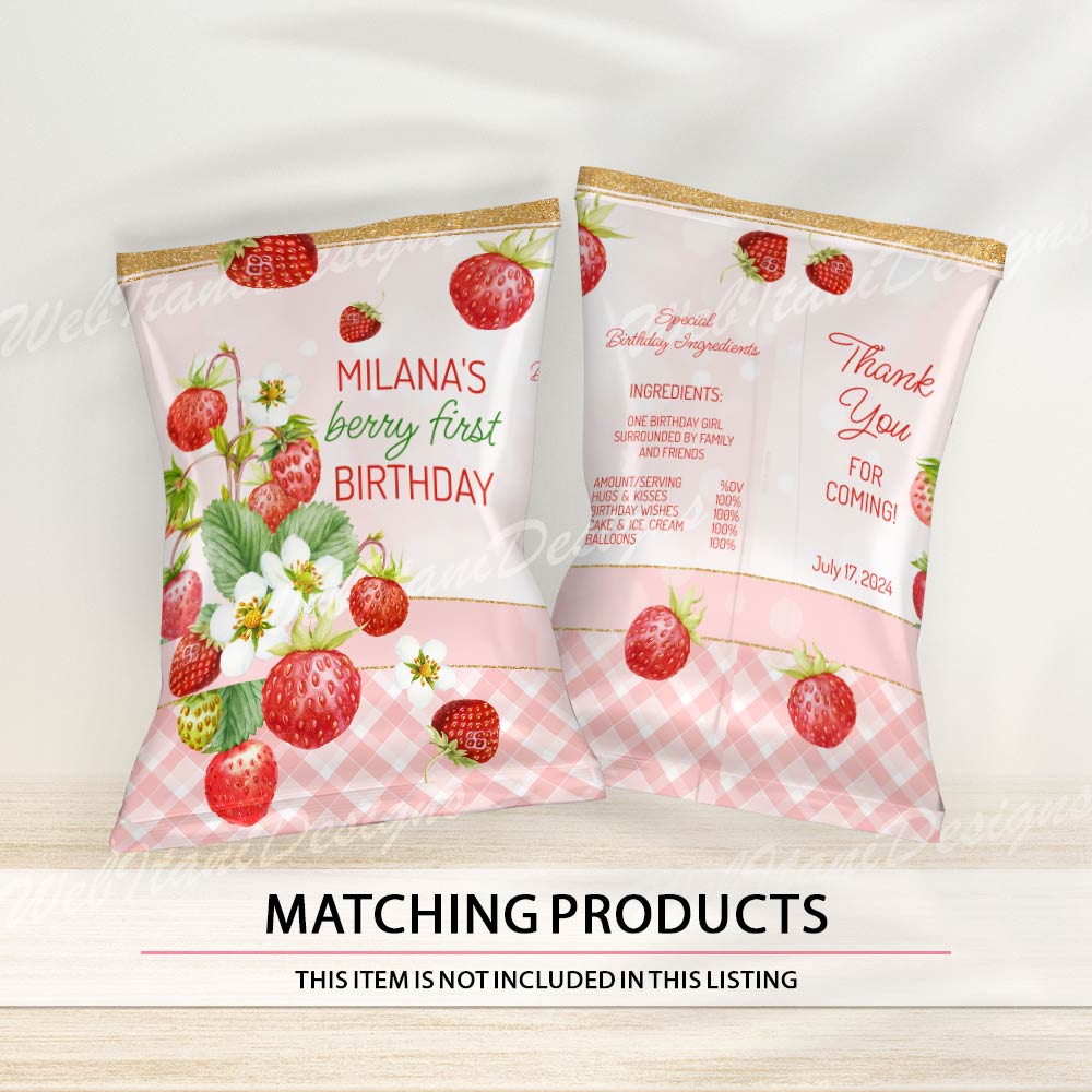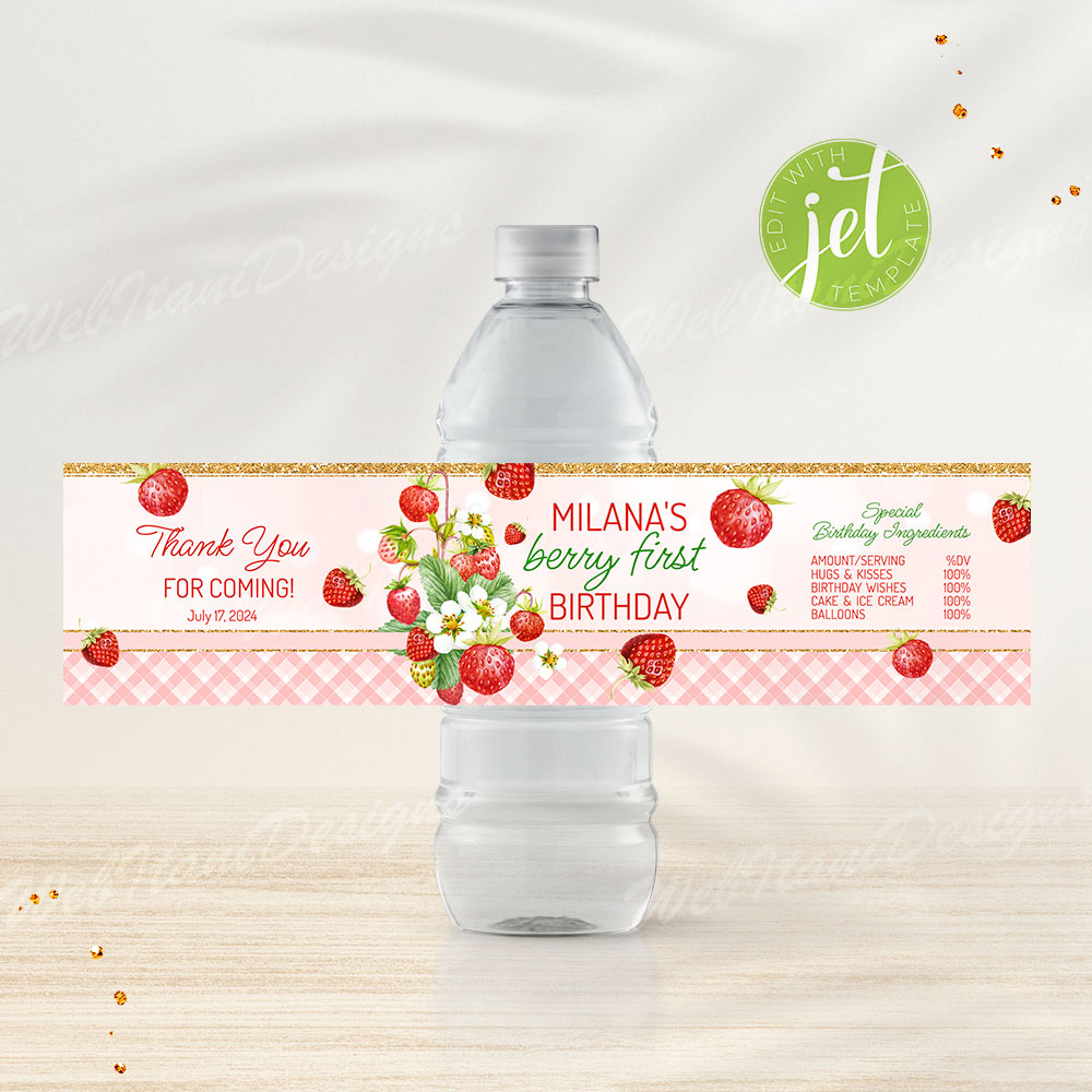 Strawberry First Birthday Water Bottle Labels – Perfect for Girl’s First Birthday Party Decorations. Strawberry Water Bottle Labels are size 8″x2″.