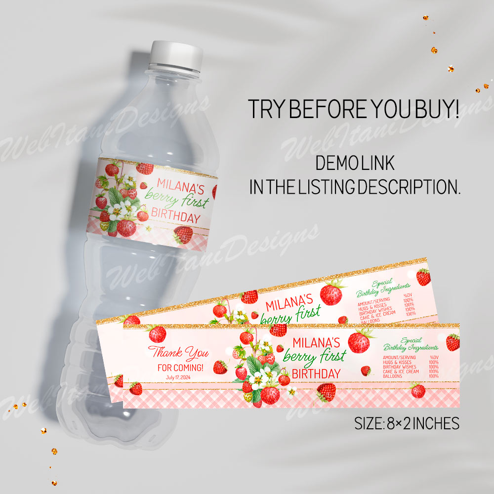 Strawberry First Birthday Water Bottle Labels are size 8″x2″.