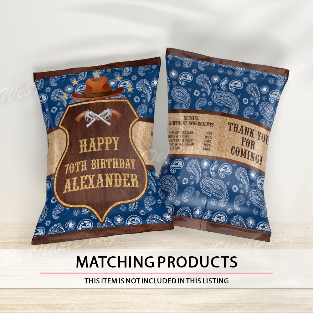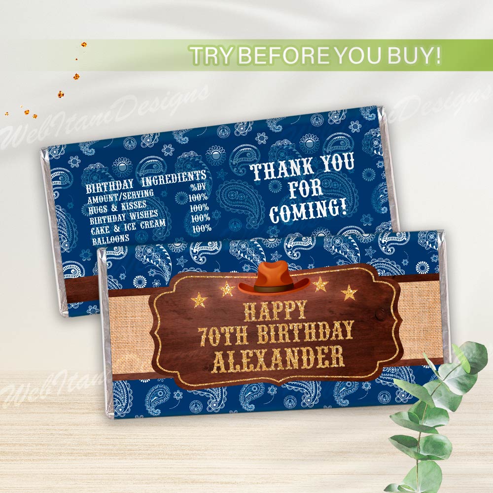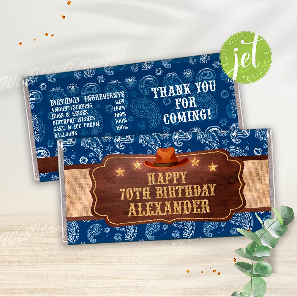Do you want to style a Blue western Party with party favors to remember? Use this editable Western candy bar wrappers template and surprise the party guests.