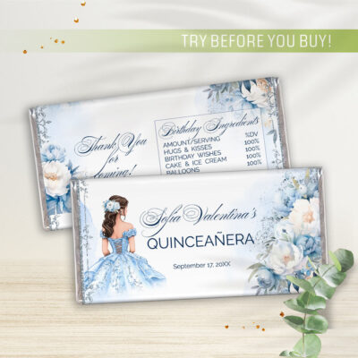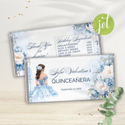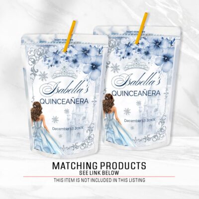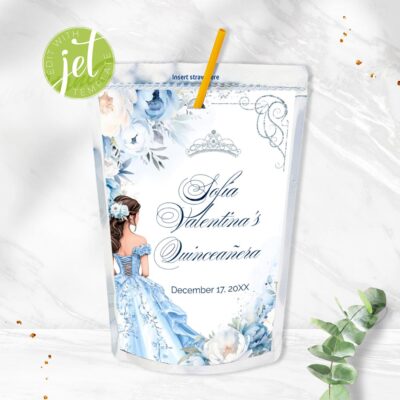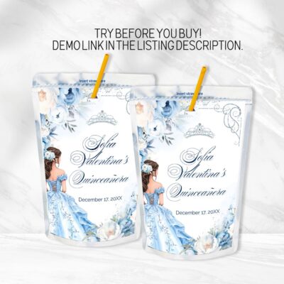 - Blue Quinceañera juice labels – elegant printable wrappers for party drinks. Perfect for a Cinderella theme. Instant download, easy to use. Try Demo, Copy and Paste into browser. https://jettemplate.com/demo/IG3511 This is a Digital Item that you'll be able to access and EDIT yourself through a link sent to your email.